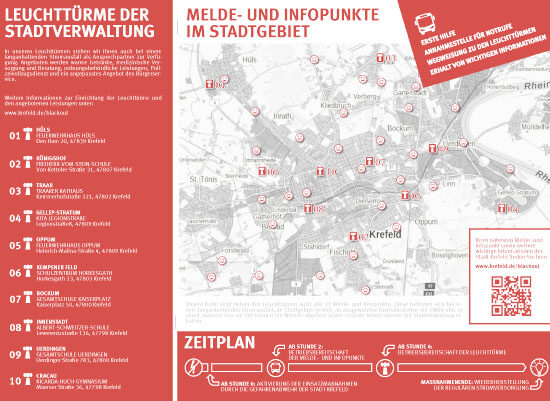 Die Stadt Krefeld hat einen Flyer veröffentlicht, auf dem nachzulesen ist, was im Falle eines Stromausfalls zu tun ist. U.a. gibt es Info- und Meldepunkte, sowie sog. Leuchttürme im Stadtgebiet. Die Info- und Meldepunkte werden in Bussen der SWK eingerichtet. Stadtweit gibt es 30 solcher Punkte. Für die Bürger im